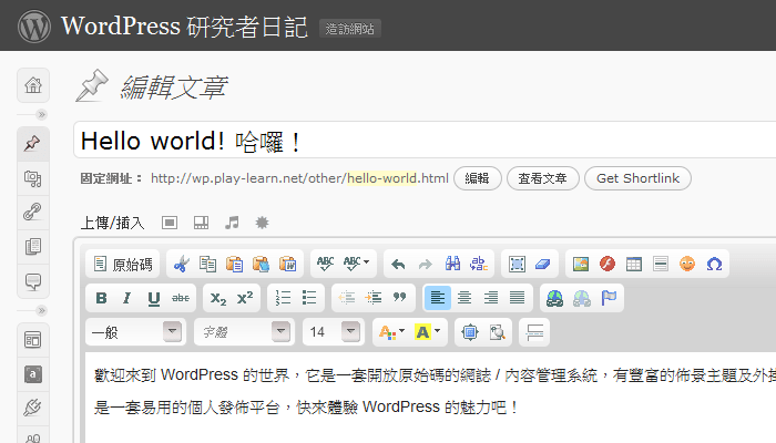 歡迎來到 WordPress 的世界,它是一套開放原始碼的網誌 / 內容管理系統。