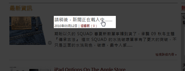 […] 7. 在首頁標題中呈現「文章載入中,請耐心等待……」jQuery連結載入文字特效,參考下圖所示。至於怎麼修改,您可以參考此部落格修改 […]
